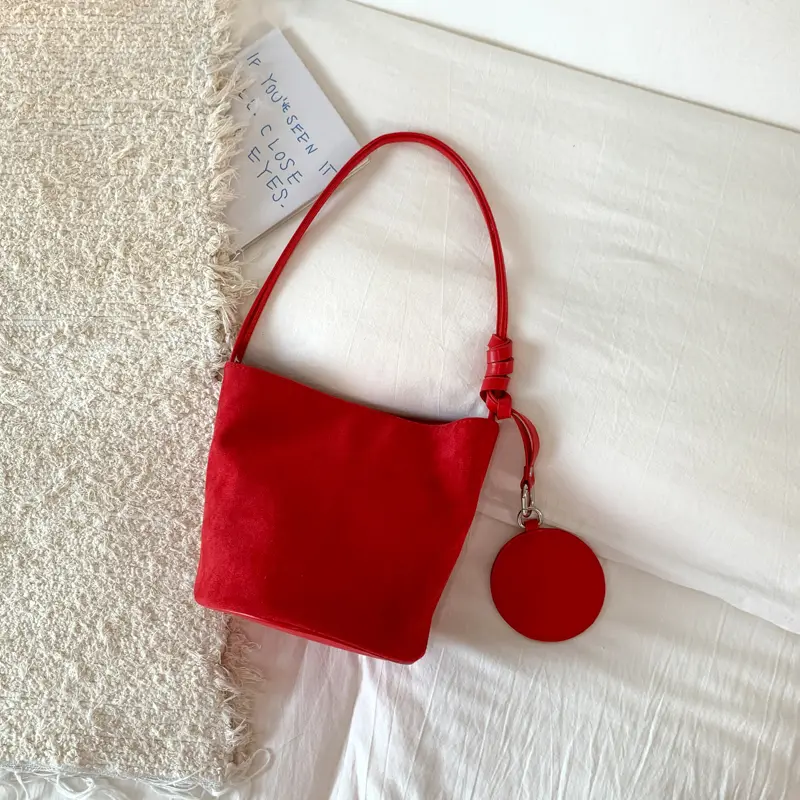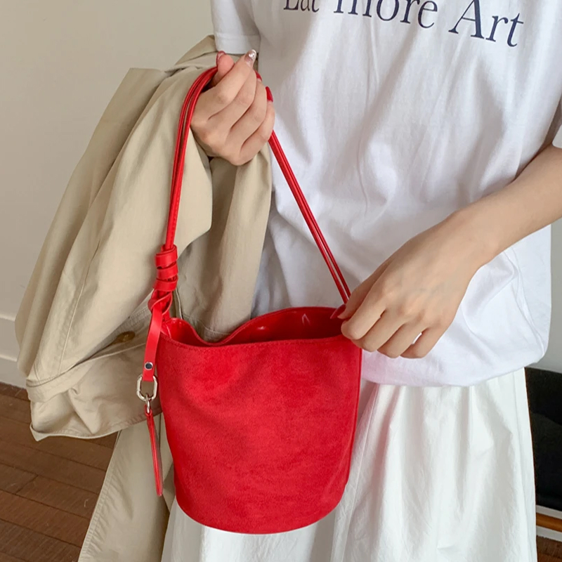 High Concern Chemicals: None Appearance: Solid Color Interior: No Pockets Stiffness: Soft Style: Casual Material: Suede Shape: Bucket Bag Size: 25x19x16cm Color:Red..